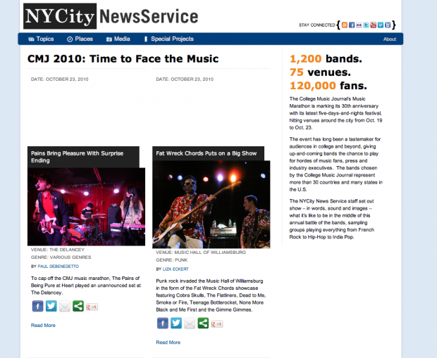 Part of multi-contributor project on CMJ 2010 I pitched, covered, co-edited for the NY City News Service. By Day Three of the CMJ […]